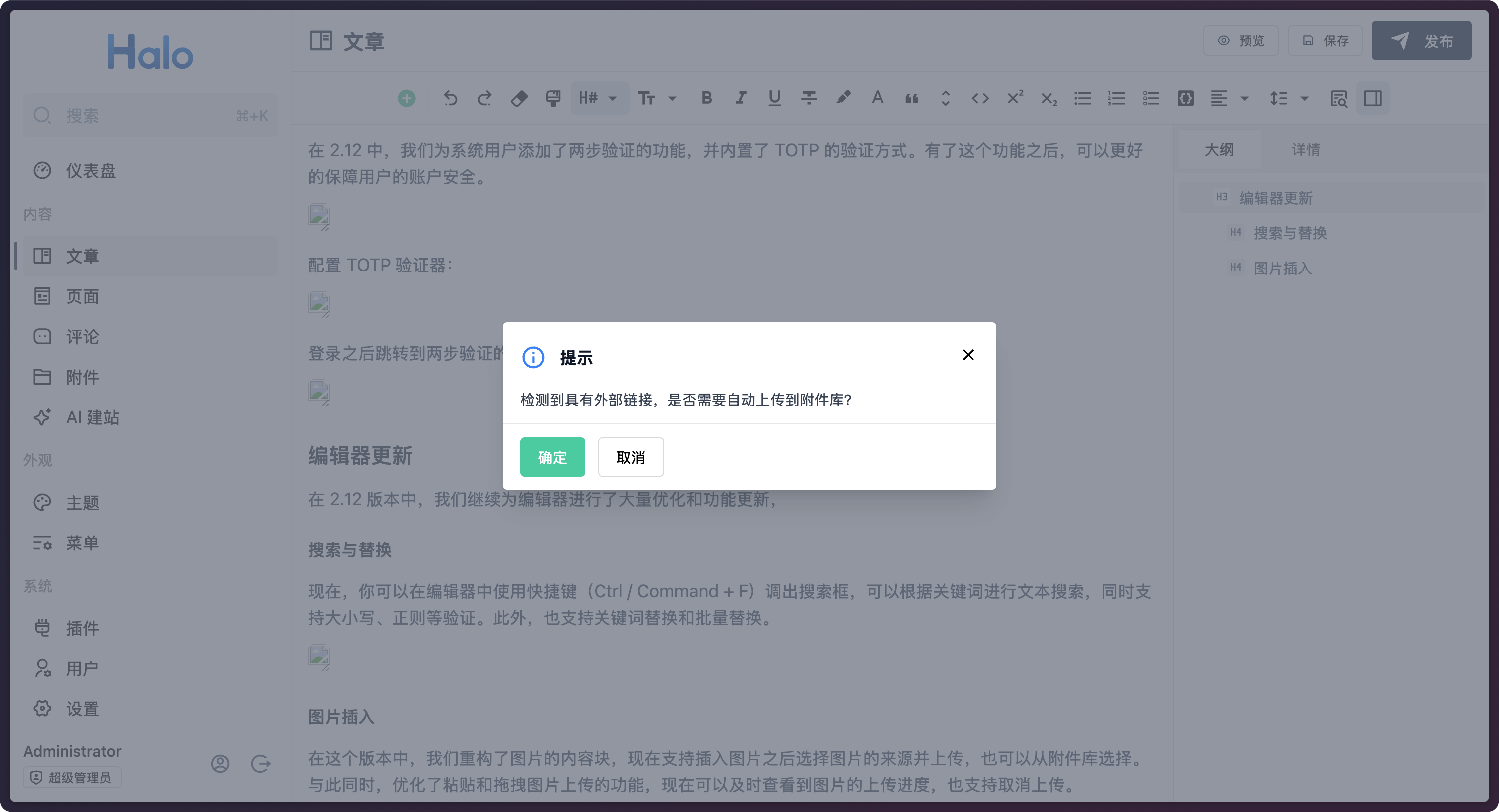 在最新发布的 Halo 2.21.7 中,我们在编辑器中添加了外部资源一键转存的功能,如果你想将其他地方编写的文章复制到 Halo 站点中并同时上传图片,那么这个功能将非常方便。此外,除了粘贴文章时支持一键转存,还可以在后续针对单个图片、视频、音频进行转存操作。