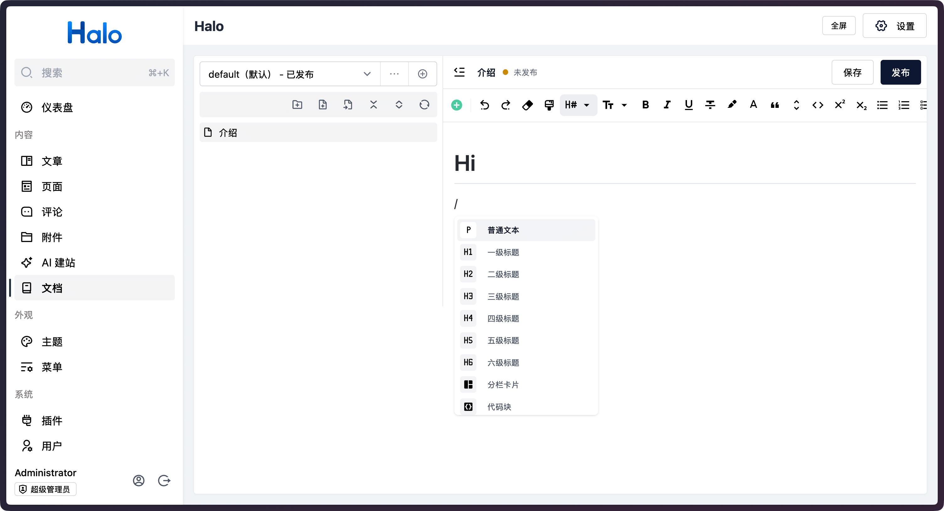 在 Docsme 1.0.0 中,我们为文档添加了 Halo 富文本编辑器的支持,同时支持部分编辑器扩展。有了富文本编辑器之后,可以为文档添加更加丰富的内容。