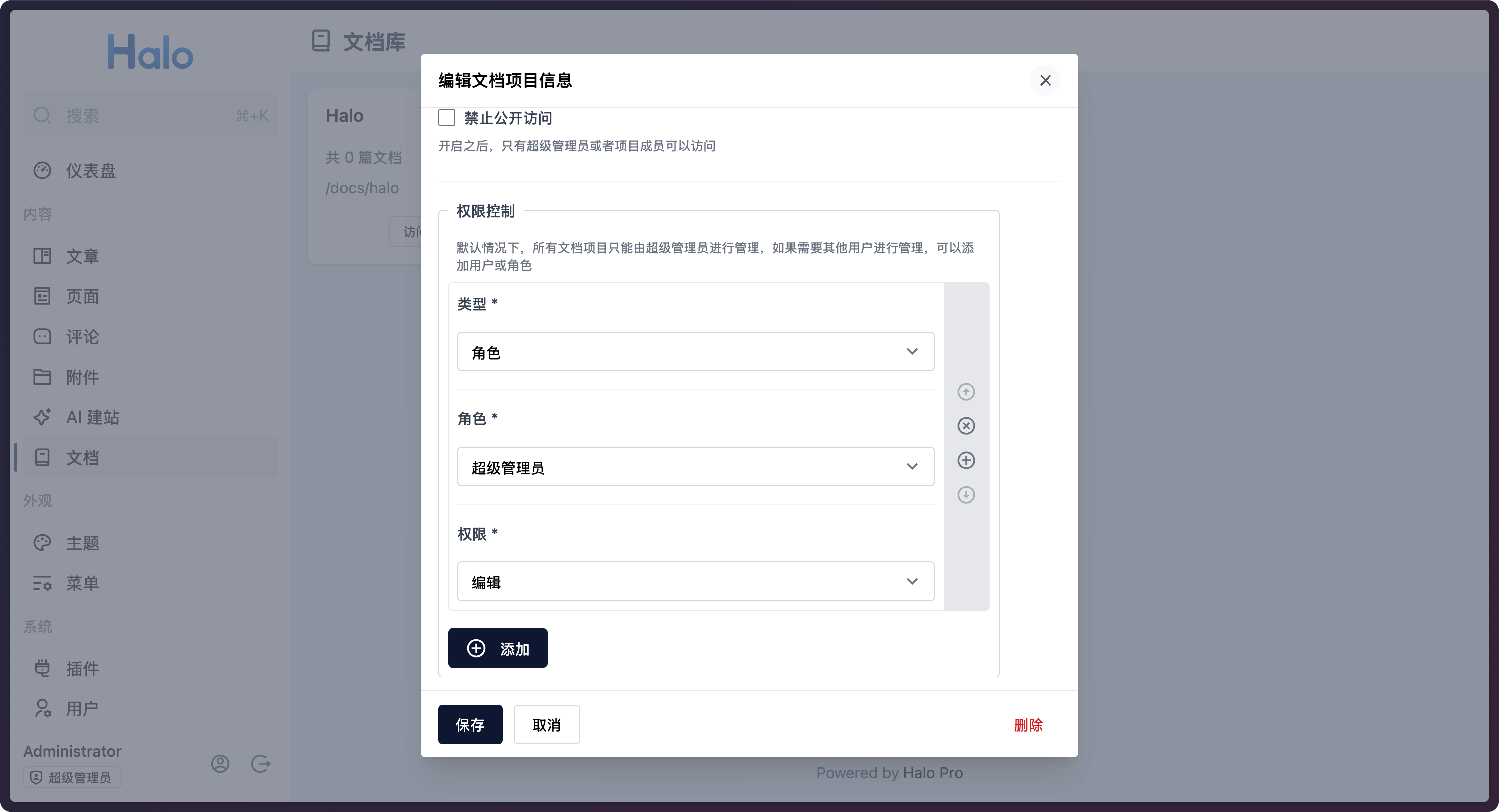 在 Docsme 1.1.0 中,我们为 Docsme 中的文档项目添加了权限控制支持,支持为某个用户或者权限设置文档的管理、编辑、只读权限。除此之外,还为文档项目添加了 禁止公开访问 的选项,勾选之后,只有超级管理员和包含只读权限的用户可访问。