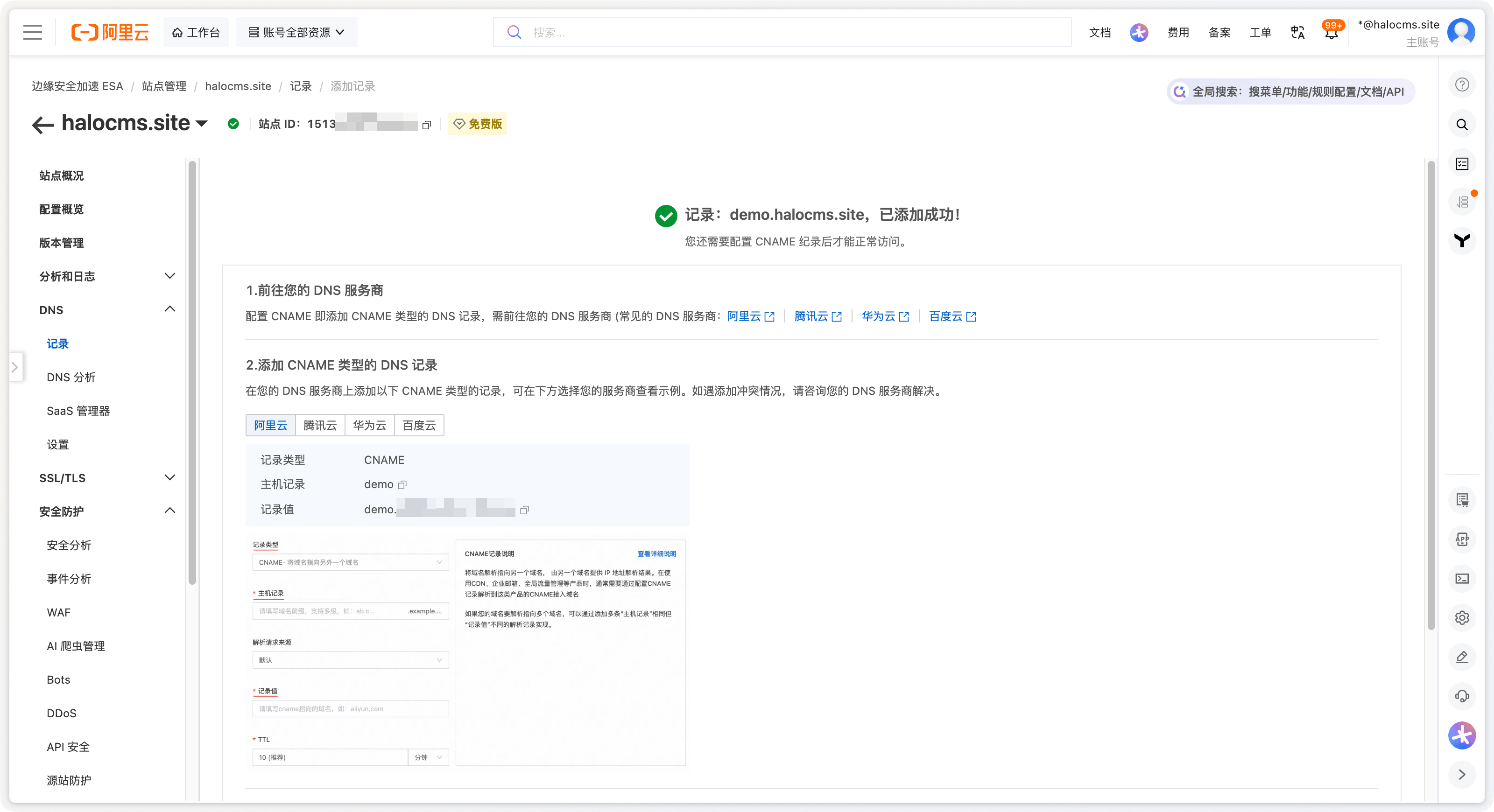 特别注意:请不要为 Halo 配置阿里云的 CDN 产品。传统 CDN 不支持 Halo 在使用的