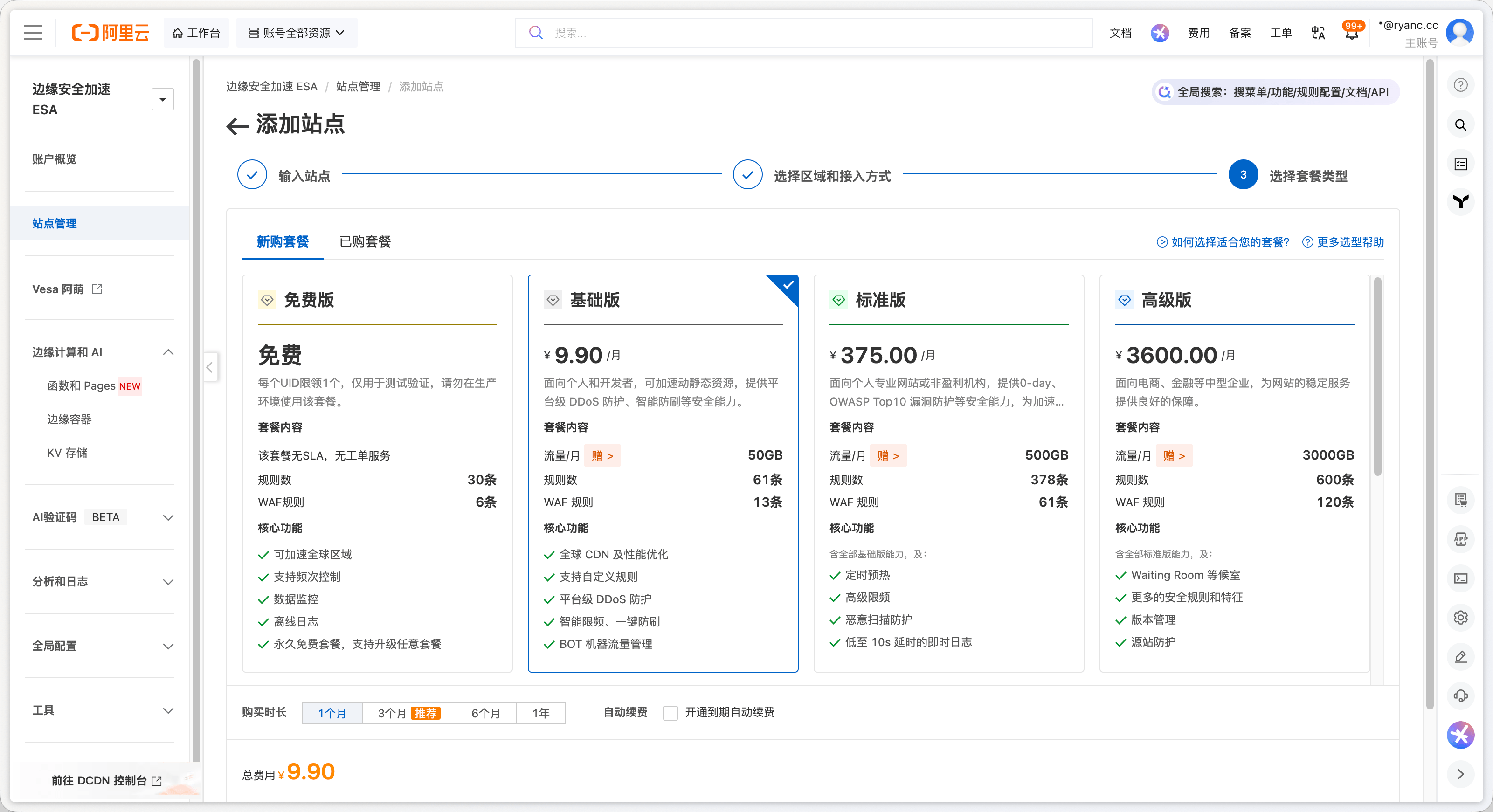标准版/高级版:适合中小型商业站点,包含更多安全规则和边缘计算额度