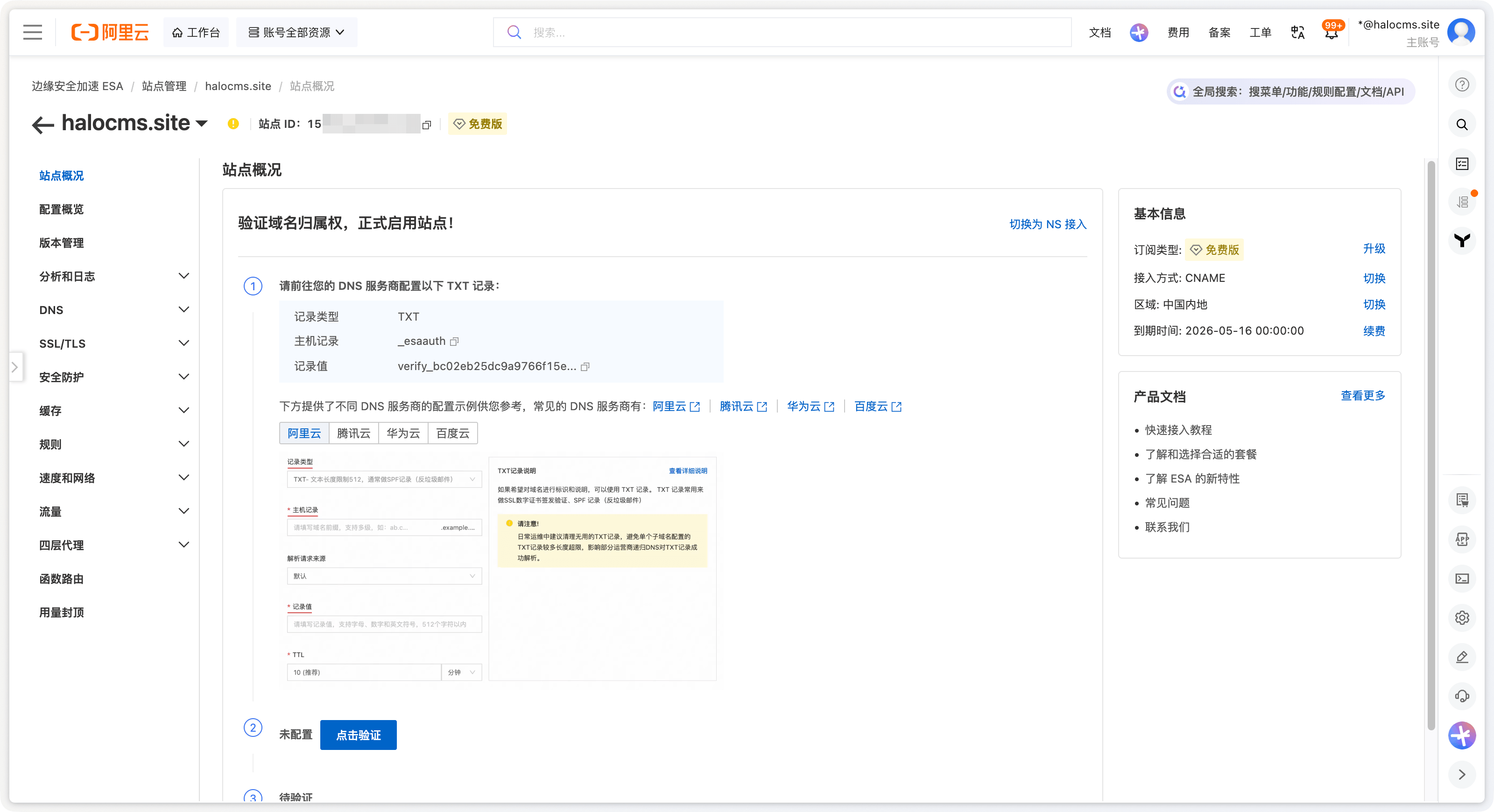 访问 阿里云 ESA 控制台,首次使用需要开通服务。开通后点击添加站点。