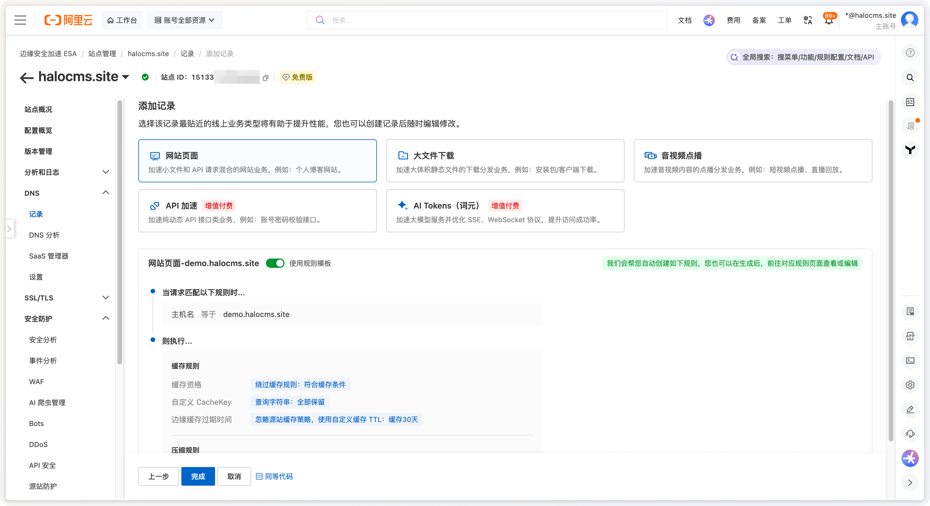 8090,若前面已有 Nginx 反代到标准端口则按80/443填写。回源 Host 默认与请求 Host 一致即可,若有特殊回源需求可在 回源规则 中调整。向导中可能要求选择业务类型(如「网站页面」)、是否使用规则模板(缓存、压缩等);对 Halo 可参考后文「边缘缓存规则」做一致或更细的调整。