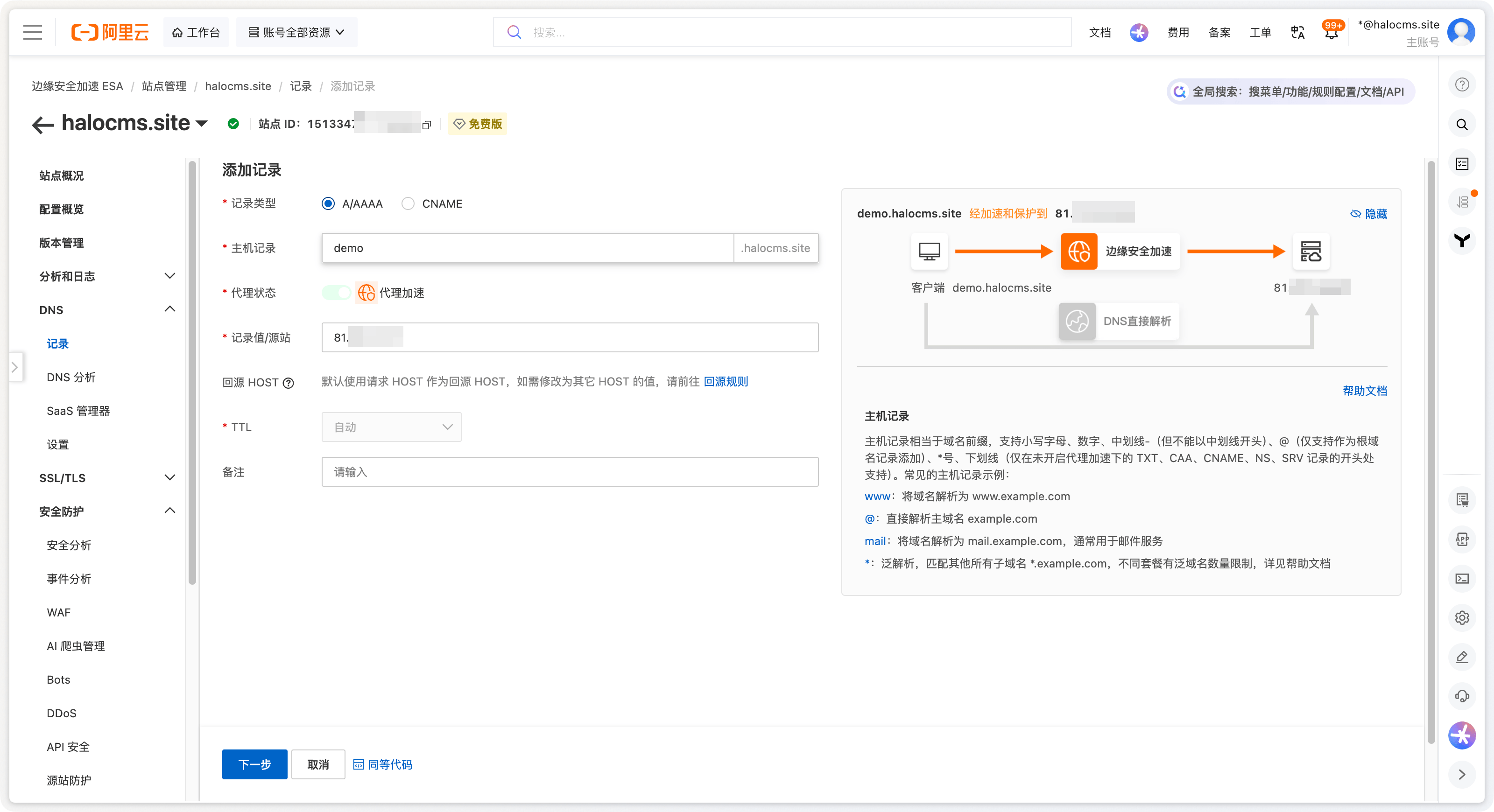 填写记录值 / 源站(如服务器公网 IP 或源站域名)、回源协议建议选协议跟随;Halo 若未反代,回源端口一般为