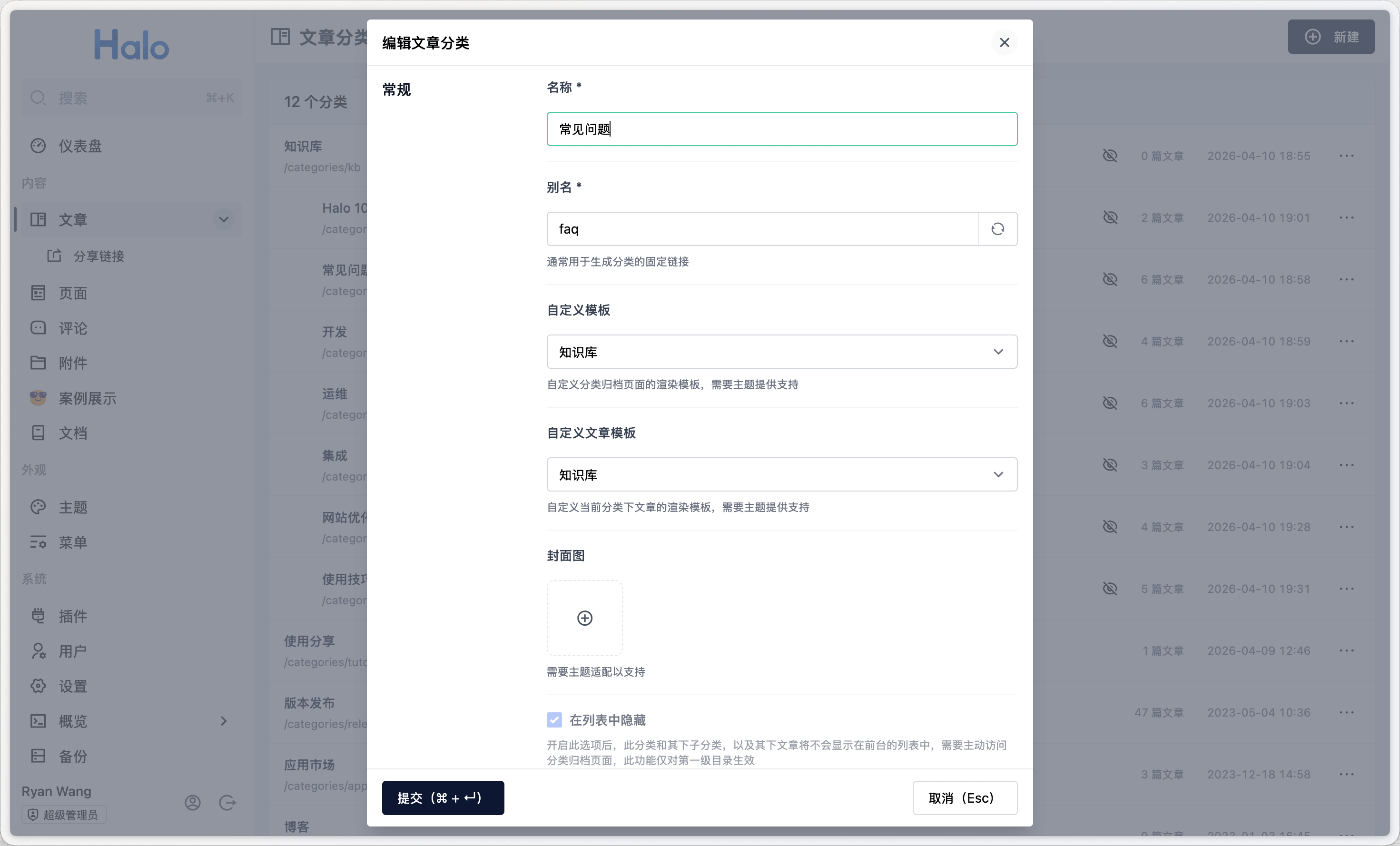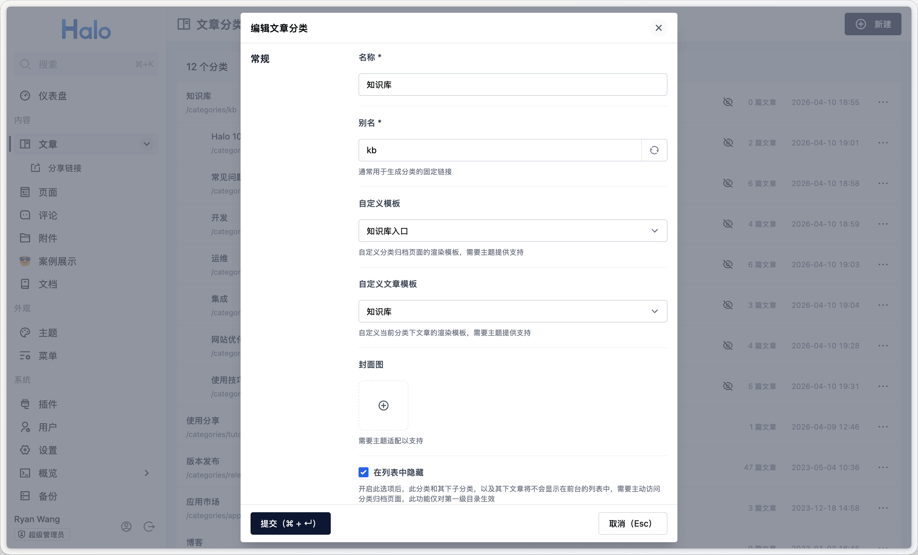 新建知识库根分类:自定义模板选择「知识库入口」,如果你为知识库的文章单独新建了文章模板,还可以在此处设置自定义文章模板为「知识库」。另外建议勾选在列表中隐藏,勾选之后该分类下的文章将不会出现在博客归档、首页文章列表等公共列表中,相当于把知识库内容从博客流中独立出来。