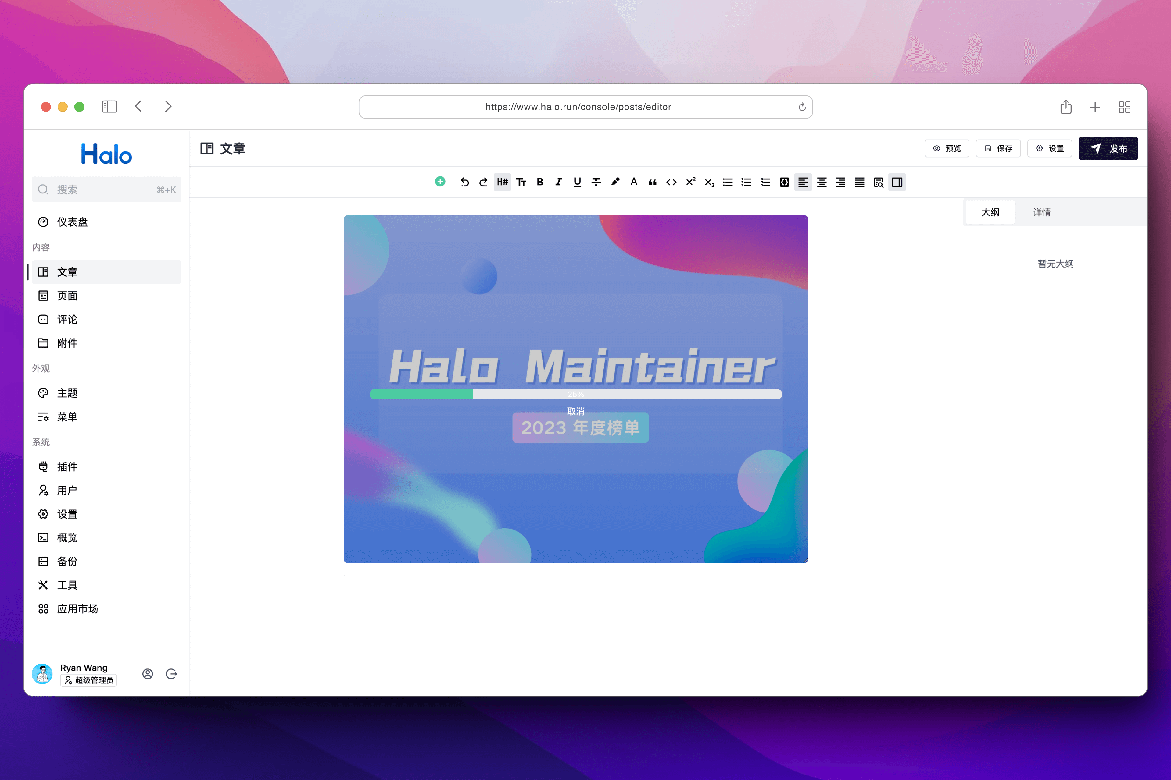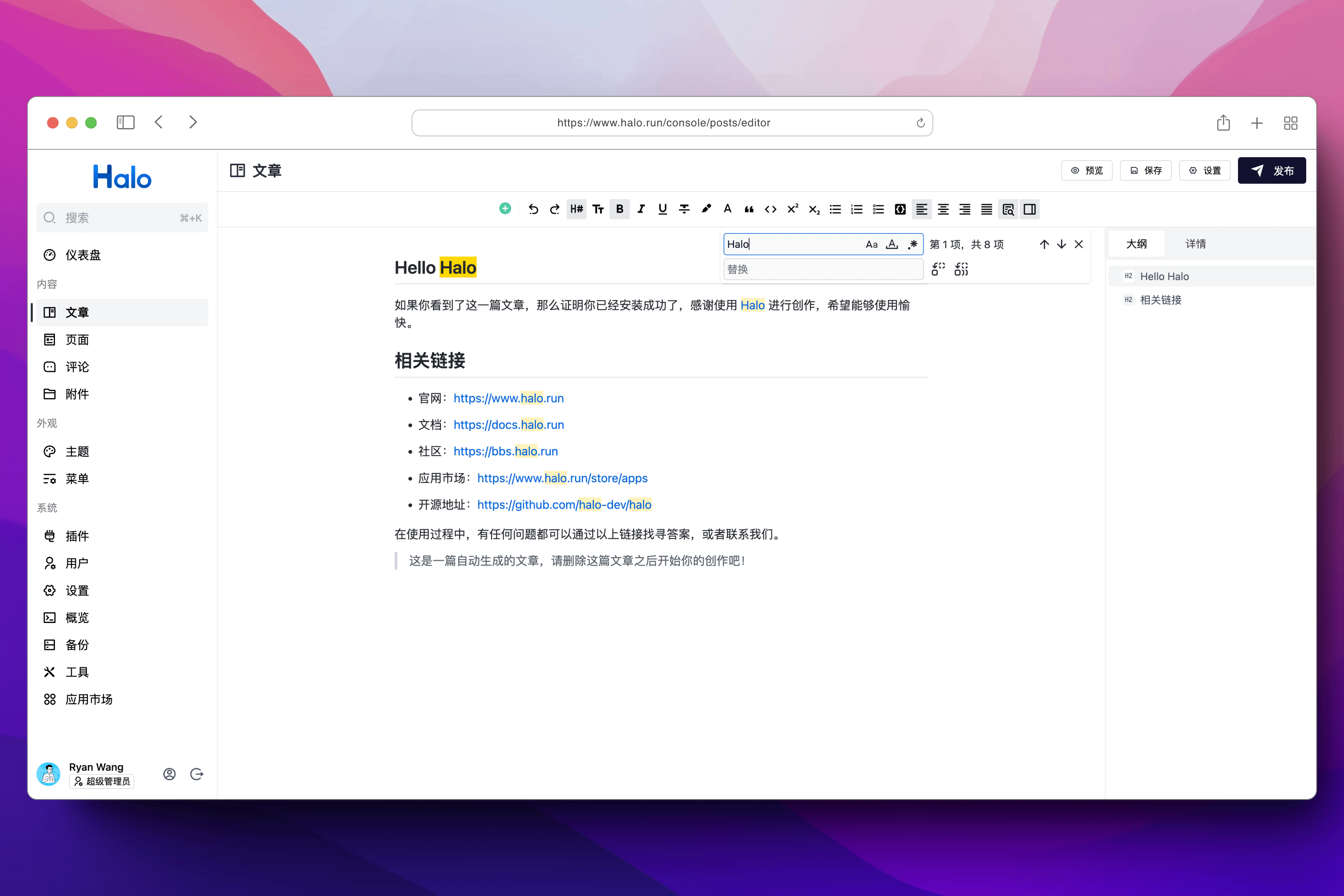 Halo 是一款强大易用的开源建站工具,它让你无需太多的技术知识就可以快速搭建一个博客、网站或者内容管理系统。具备可插拔架构、主题套用、富文本编辑器等多重特性,支持用户根据自己的喜好选择不同类型的插件及主题模板来定制化自己的站点功能及外观。让内容创作和发布更加便捷生动。