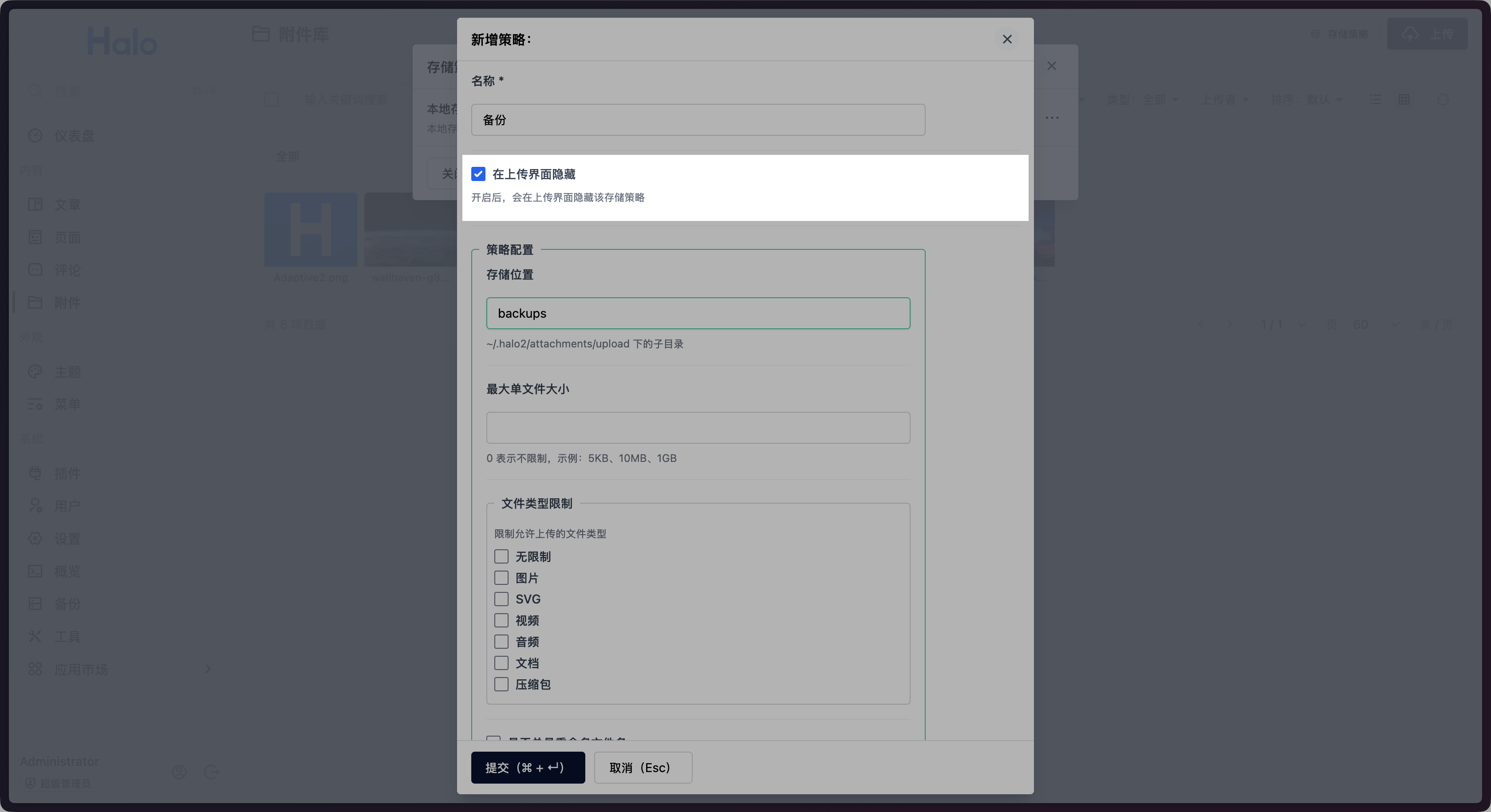 在 Halo 2.22 中,我们为附件存储策略添加了隐藏和排序的设置项,我们可以将不常用或者不会主动上传的附件存储策略进行隐藏或者调整顺序。