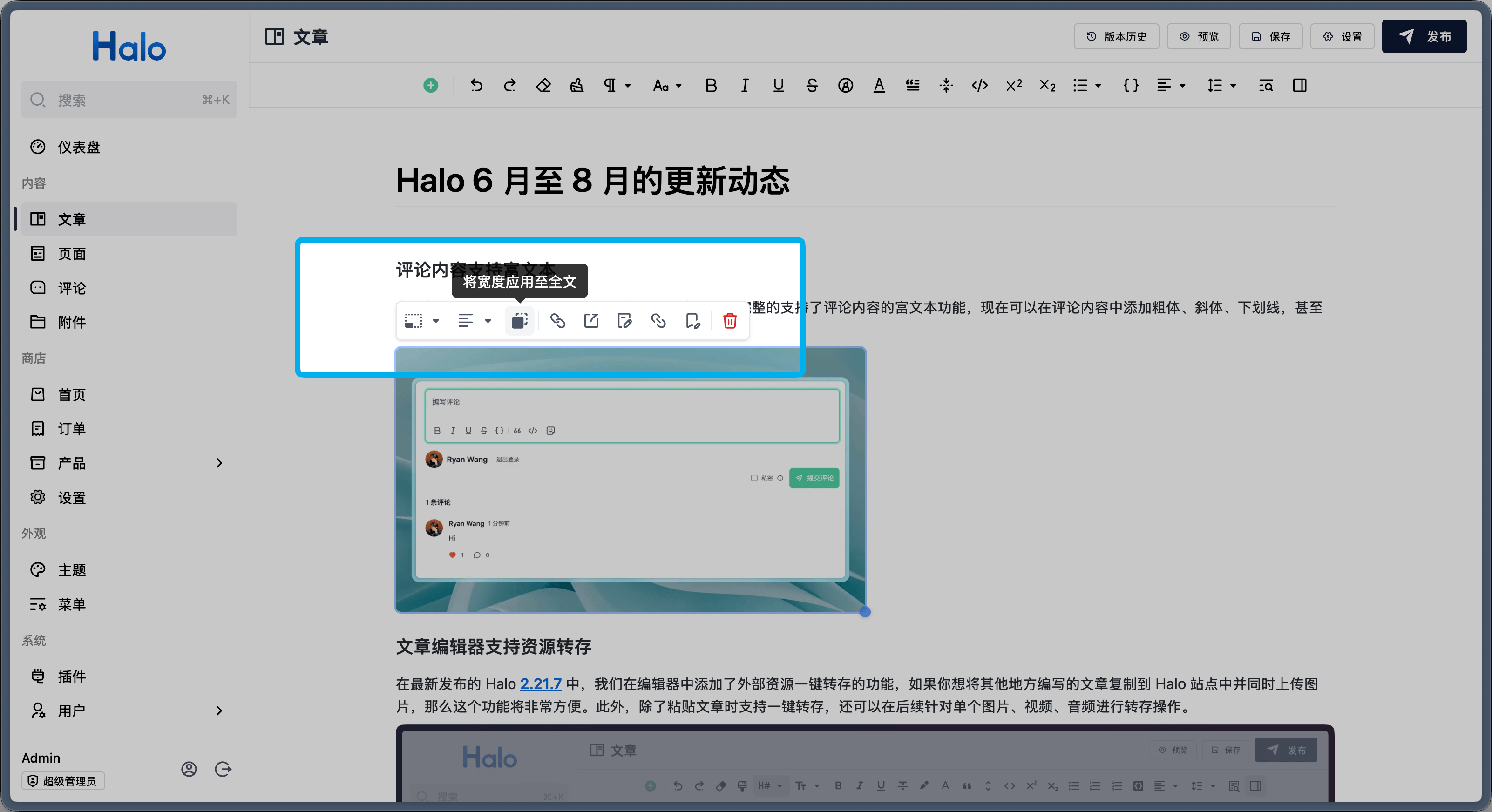 在 Halo 2.23 中,我们为编辑器添加了图片宽度应用至全文的功能,我们可以在调整好某一张图片的尺寸之后,一键为文章中所有图片设置相同的宽度,以保证图片视觉上的统一。