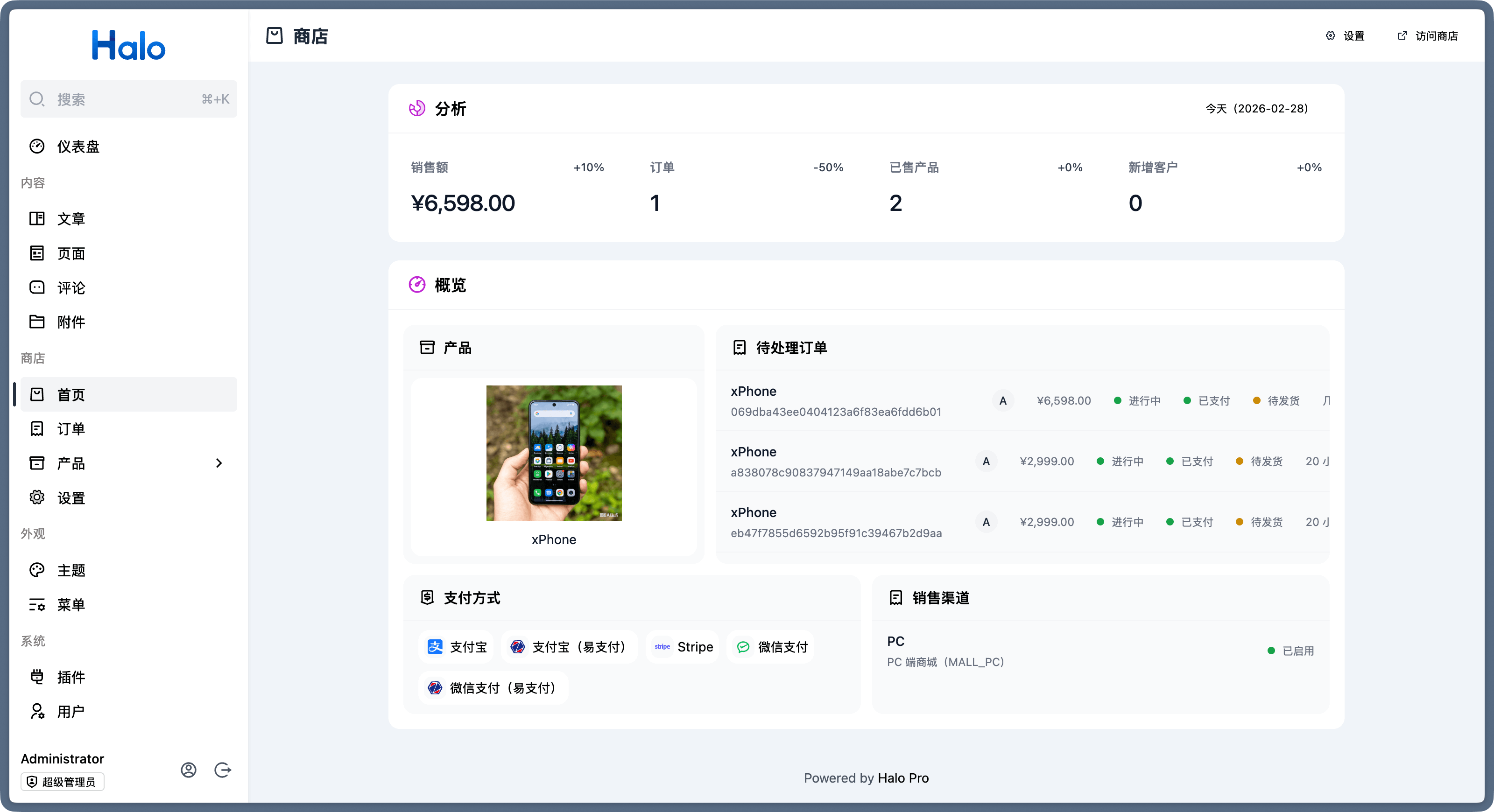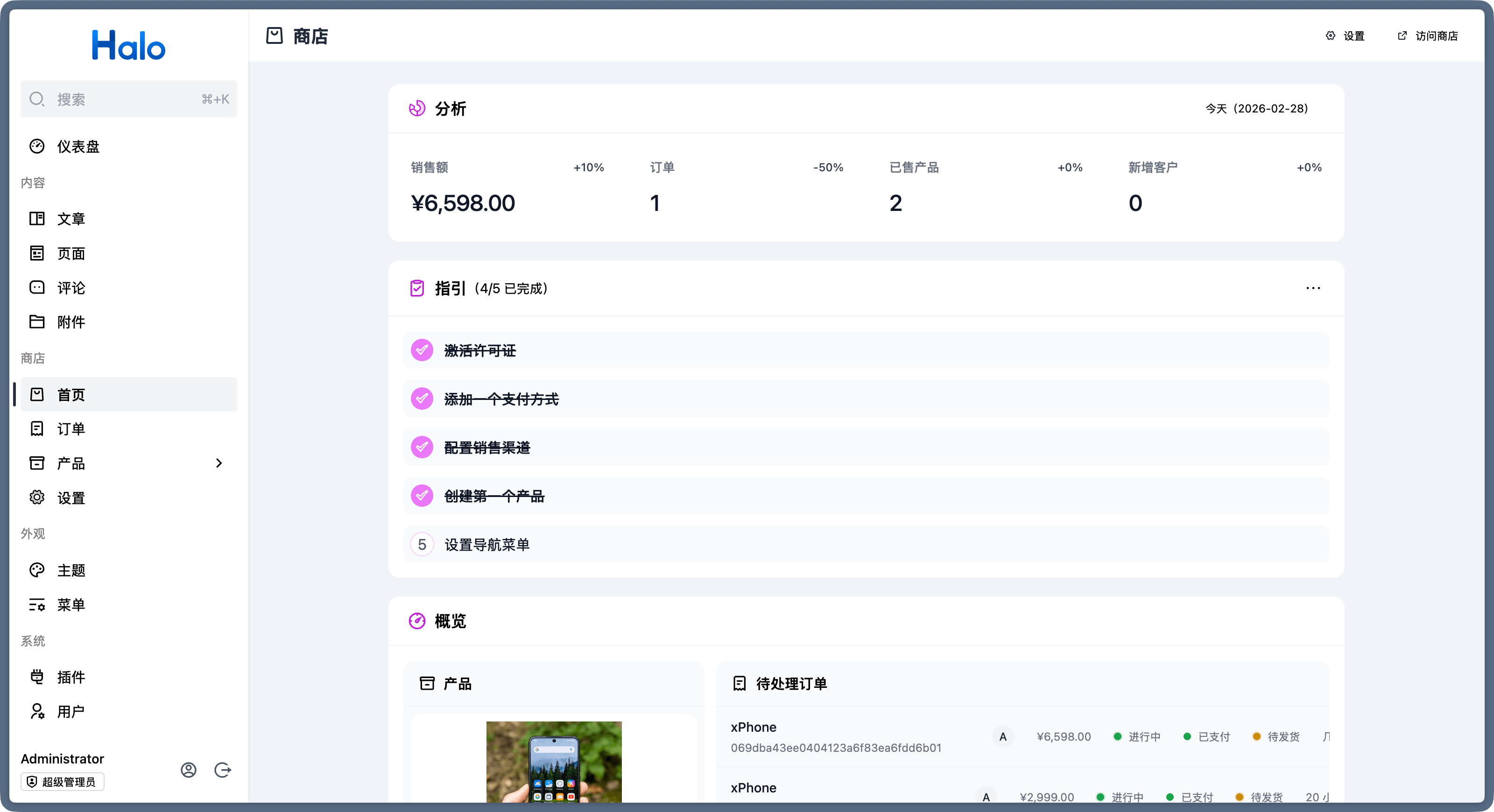 在 Halo 商业版 2.23 中,我们在 Console 添加了新的商店首页(仪表盘页面),在这个页面可以查看基本的运营数据和设置指引,以及查看当前商店的所有配置状态。