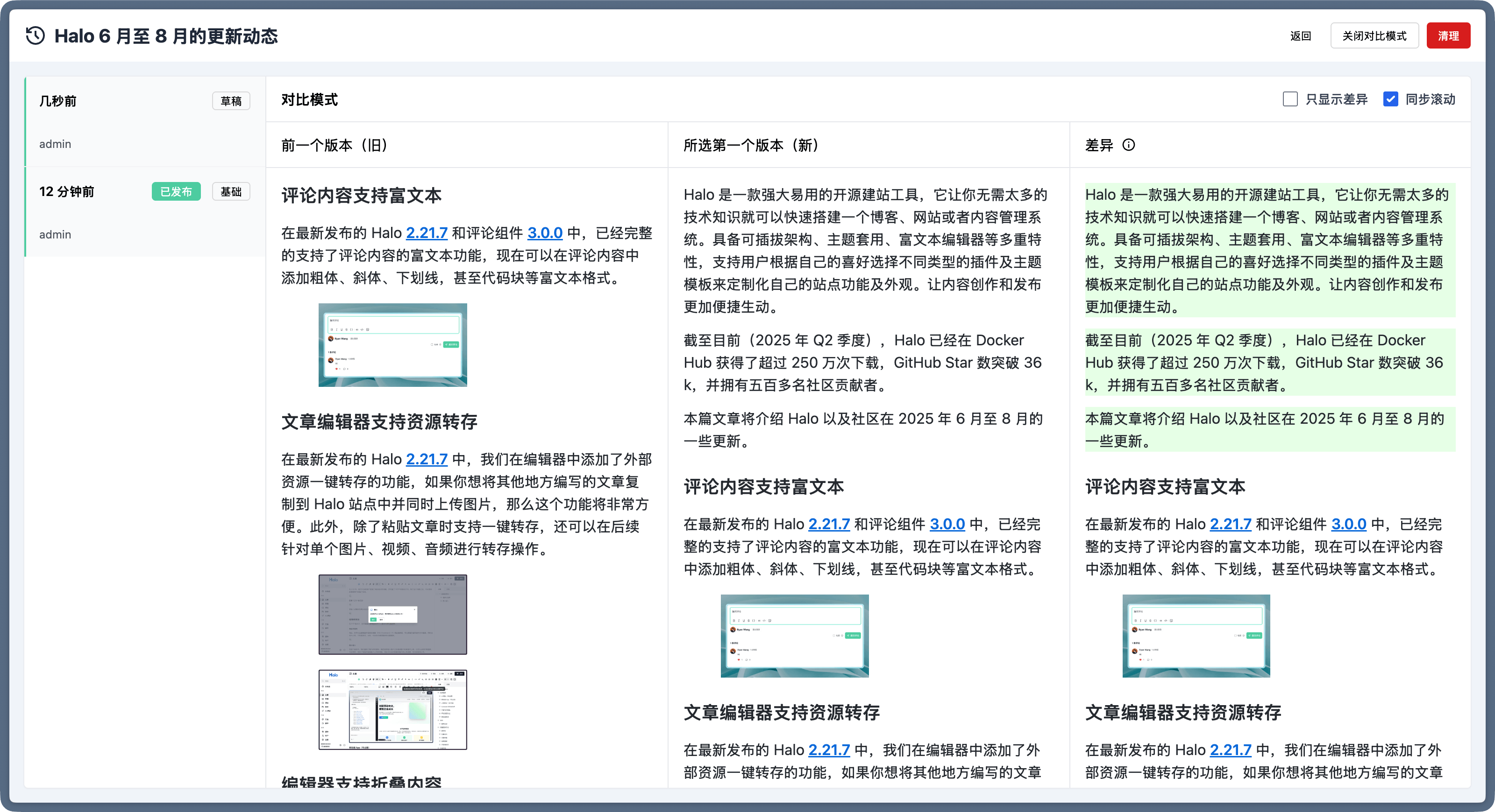 在 Halo 2.23 中,我们为文章版本支持了对比功能,现在可以选择任意两个版本进行内容对比,可以更方便查看文章的改动内容。