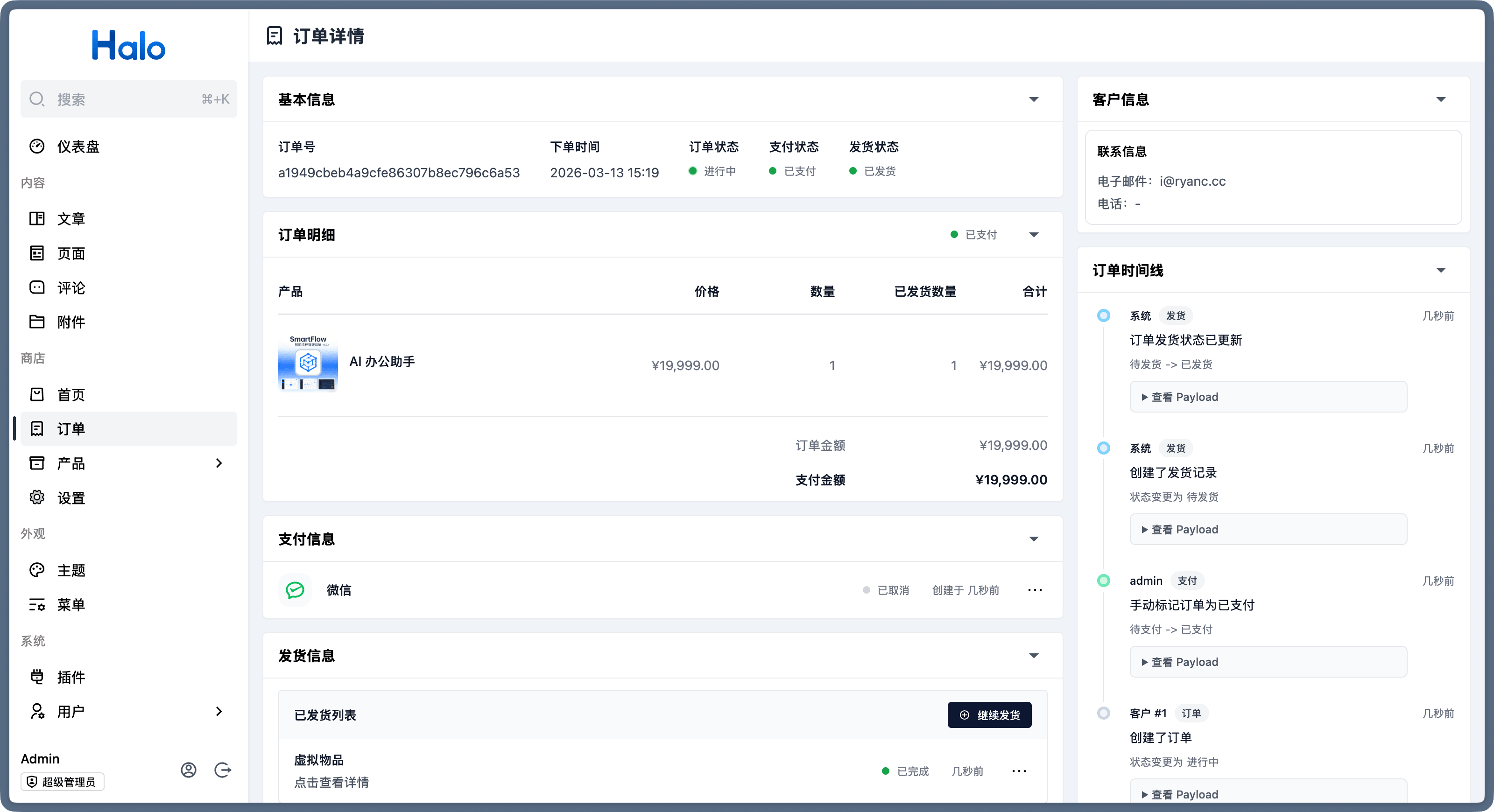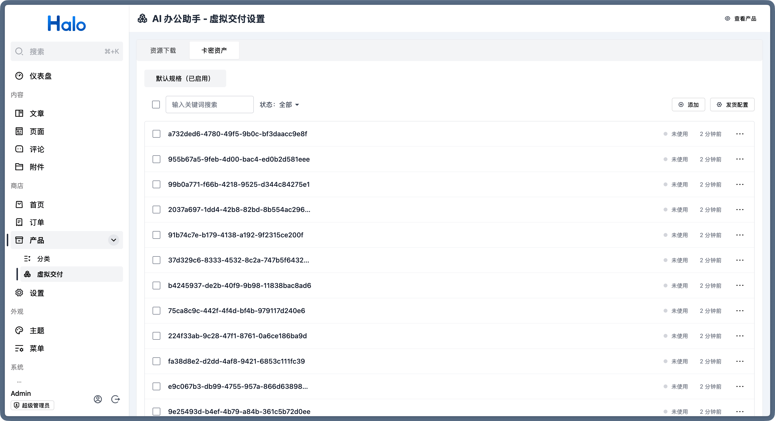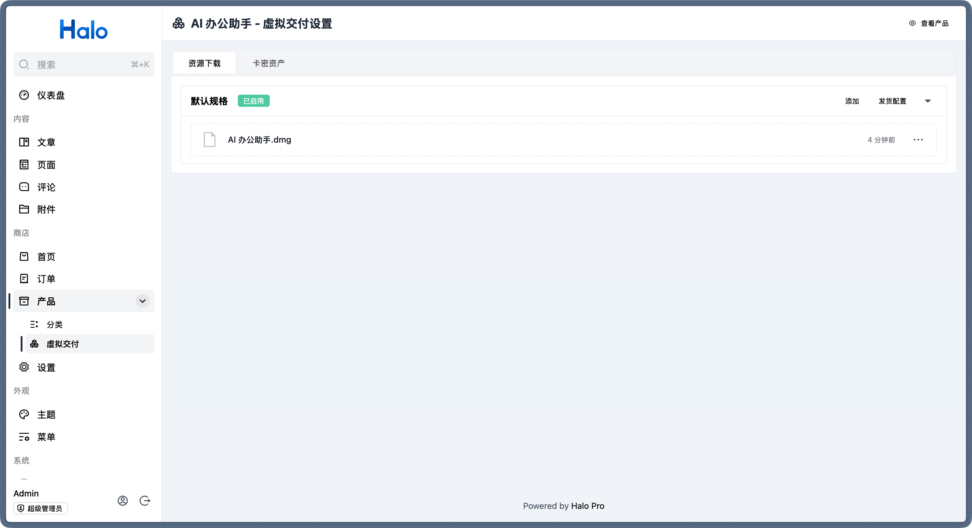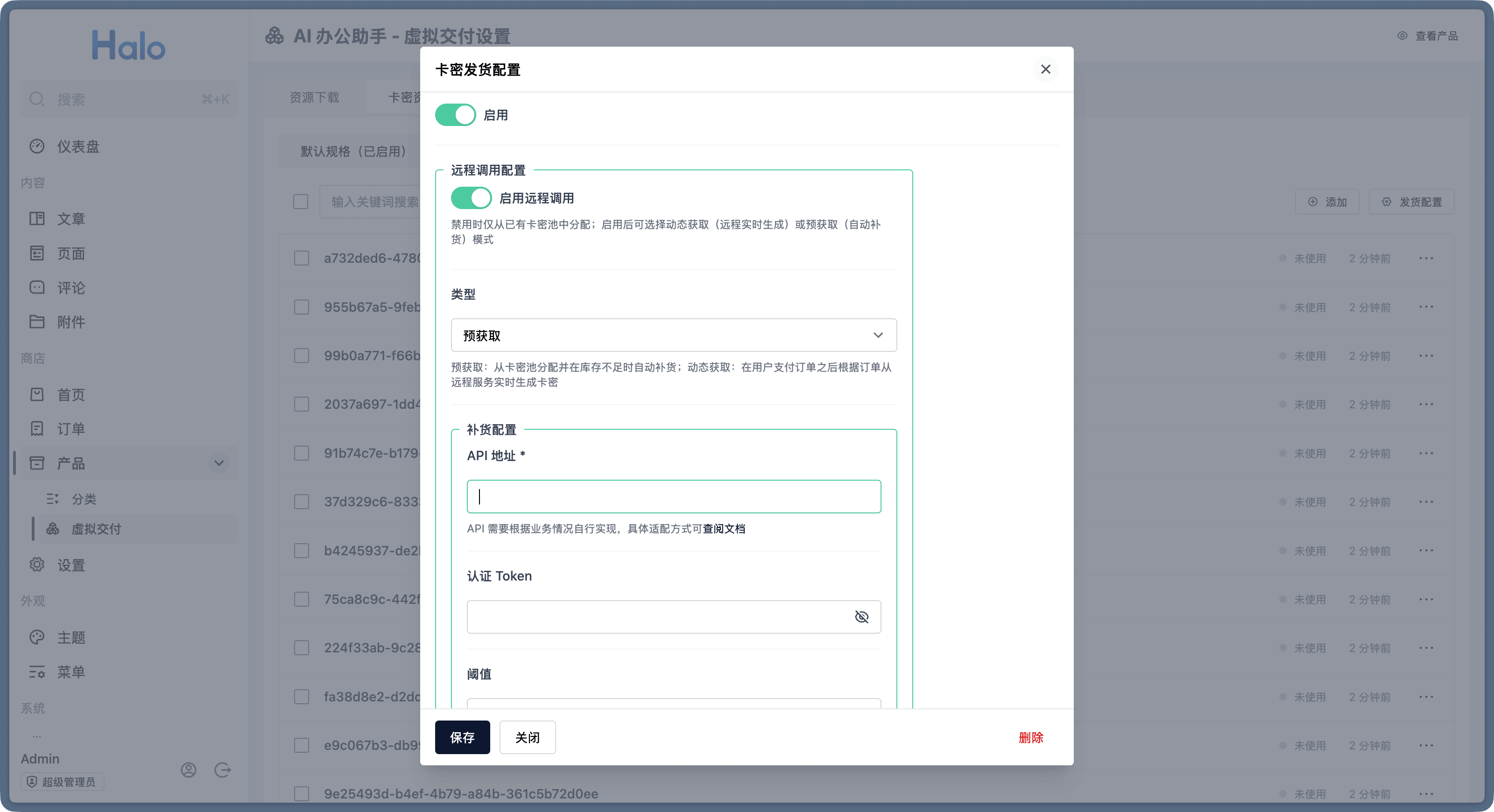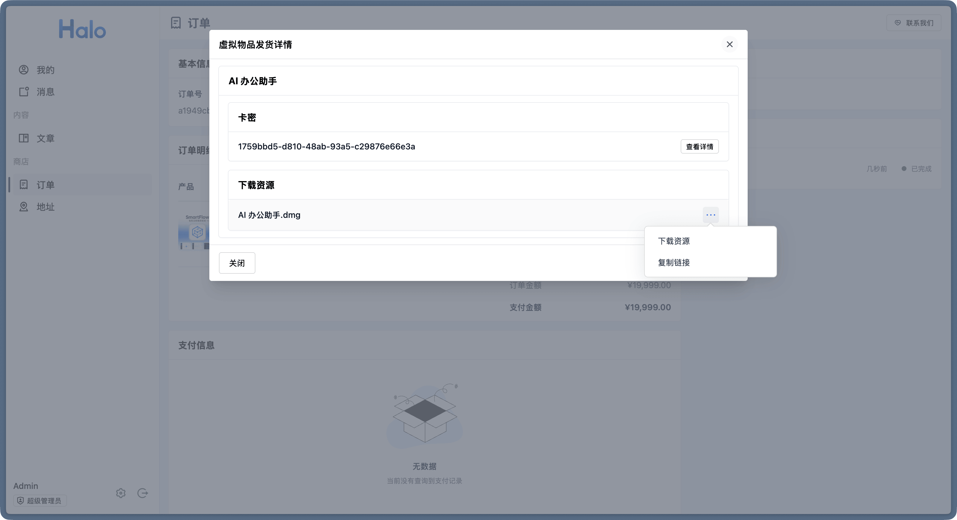 从 Halo 推出商业版以来,商品就分为实体和虚拟类型,但在之前的版本中,虚拟商品的发货还并不完善,在 Halo 商业版 2.23 中,我们进一步完善了虚拟商品的发货,支持文件下载和卡密、支持在客户支付后自动发货、卡密支持通过远程 API 动态生成。