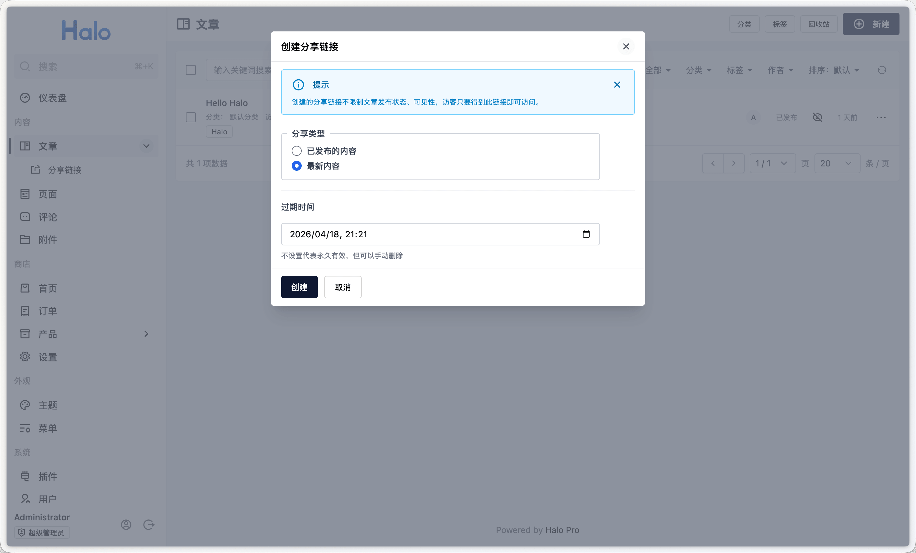 复制生成的链接,发送给对方即可。对方通过该链接可以直接访问文章内容,无需登录 Halo。