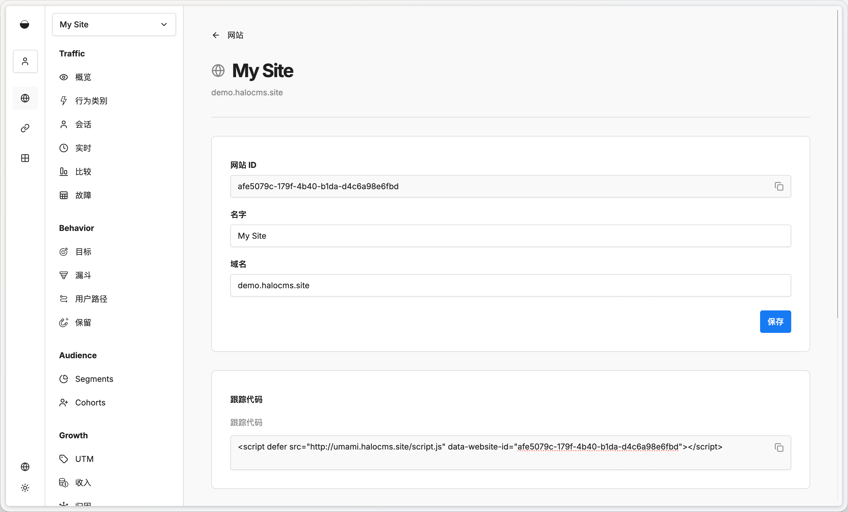 填写网站名称和域名,保存后点击页面右上角的 编辑 按钮,进入编辑页面之后可以看到一段 跟踪代码,复制这段代码,接下来将其配置到 Halo 中。