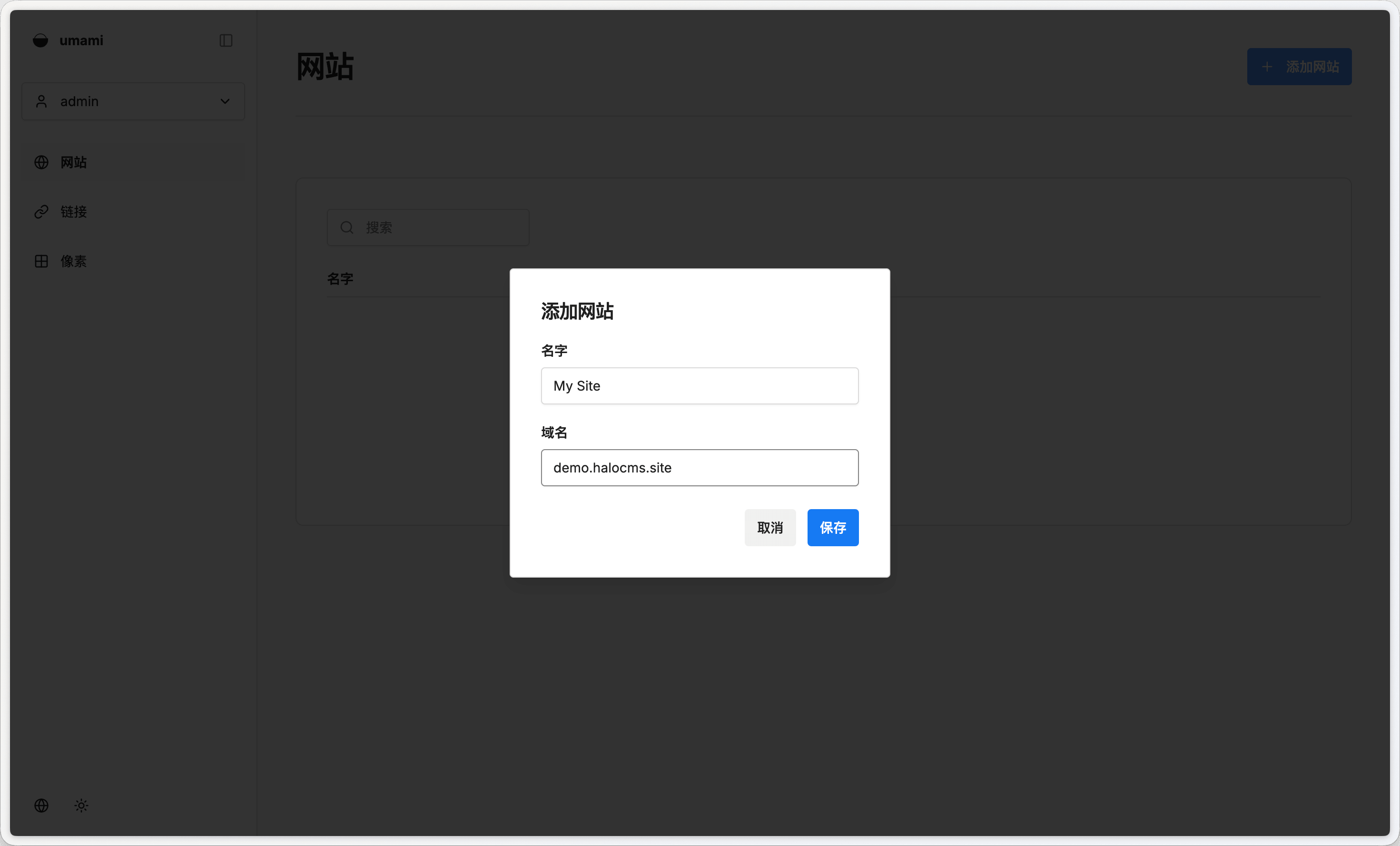 登录 Umami 控制台,进入 设置 → 网站,点击 添加网站: