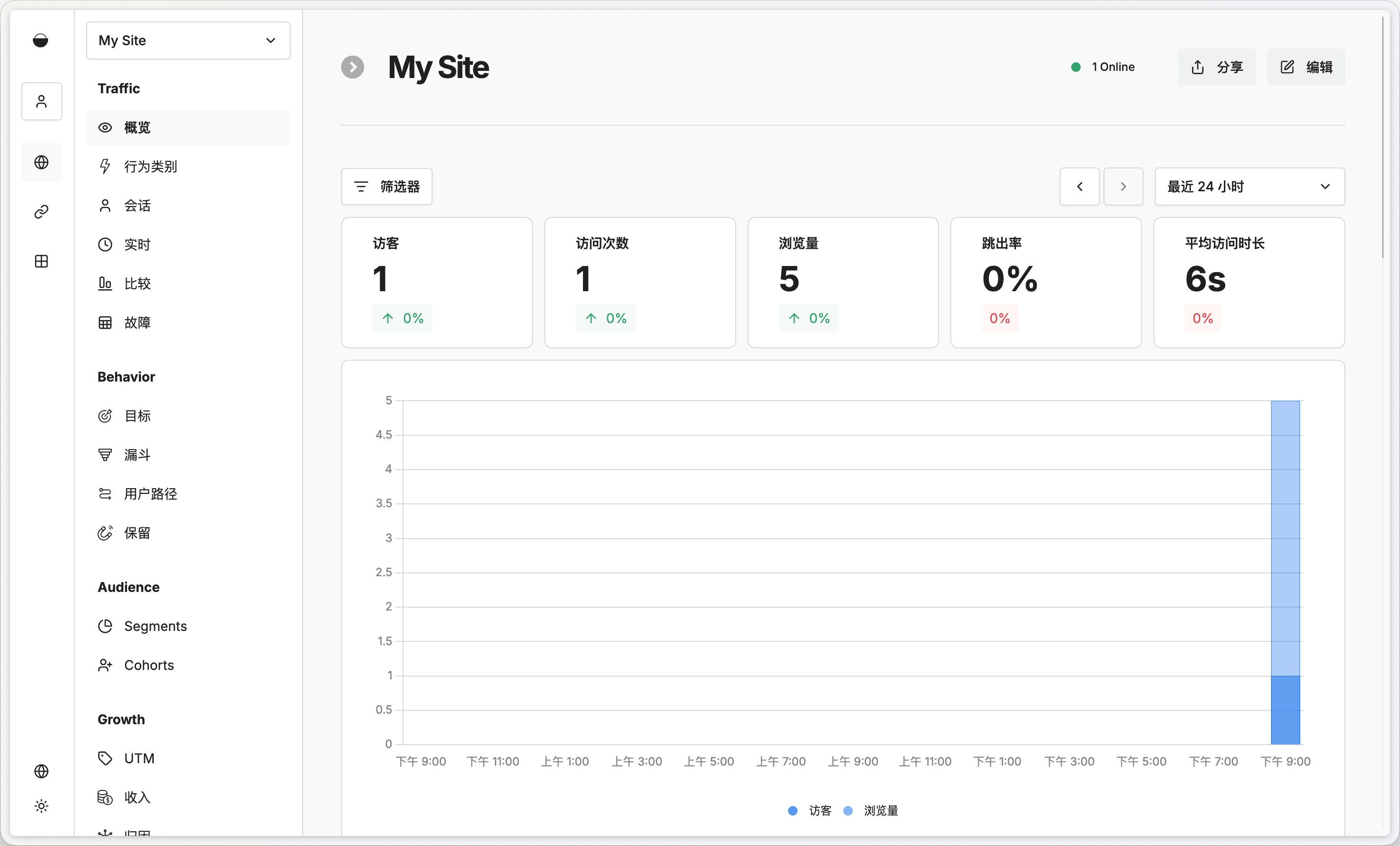 保存后,访问你的站点任意页面,回到 Umami 控制台即可看到实时数据。