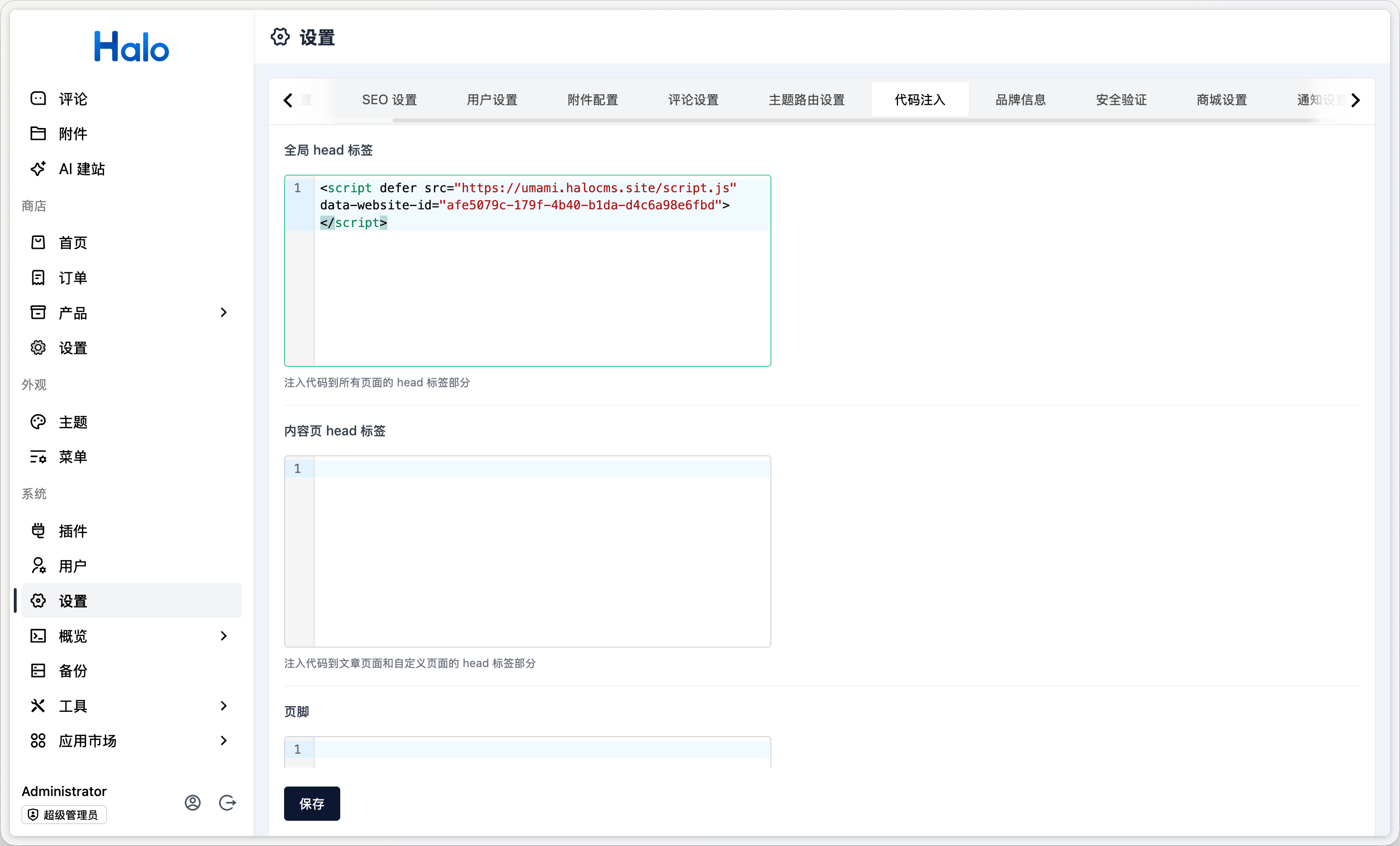 登录 Halo 控制台,进入 设置 → 代码注入,将复制的追踪代码粘贴到 全局 head 标签 输入框中: