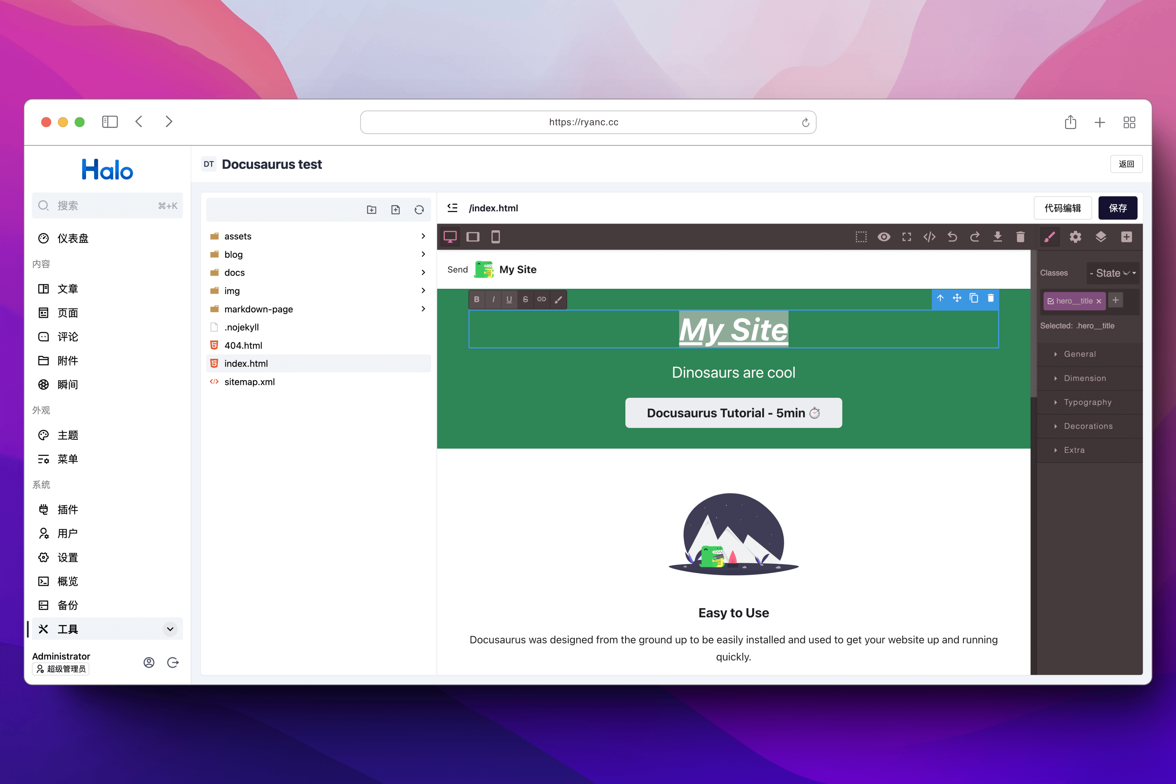 到这一步,你的作品已经"活在互联网上"了。你甚至可以体验 Halo 的可视化编辑这个实验性功能,在线编辑你的 HTML 文件。整个过程不需要写一行命令。