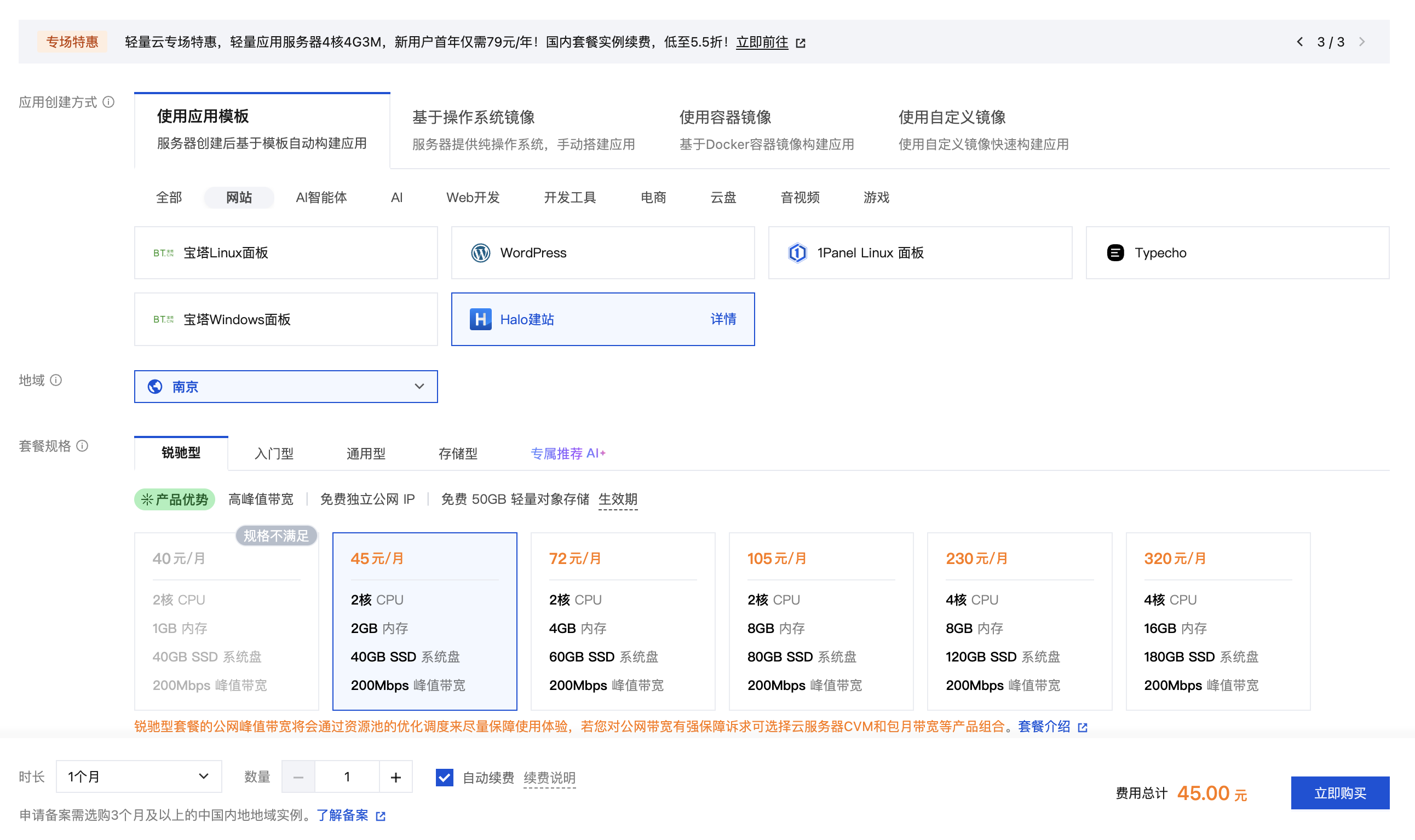 购买轻量云服务器(阿里云/腾讯云,选 Halo 镜像,约 50-100 元/年起)