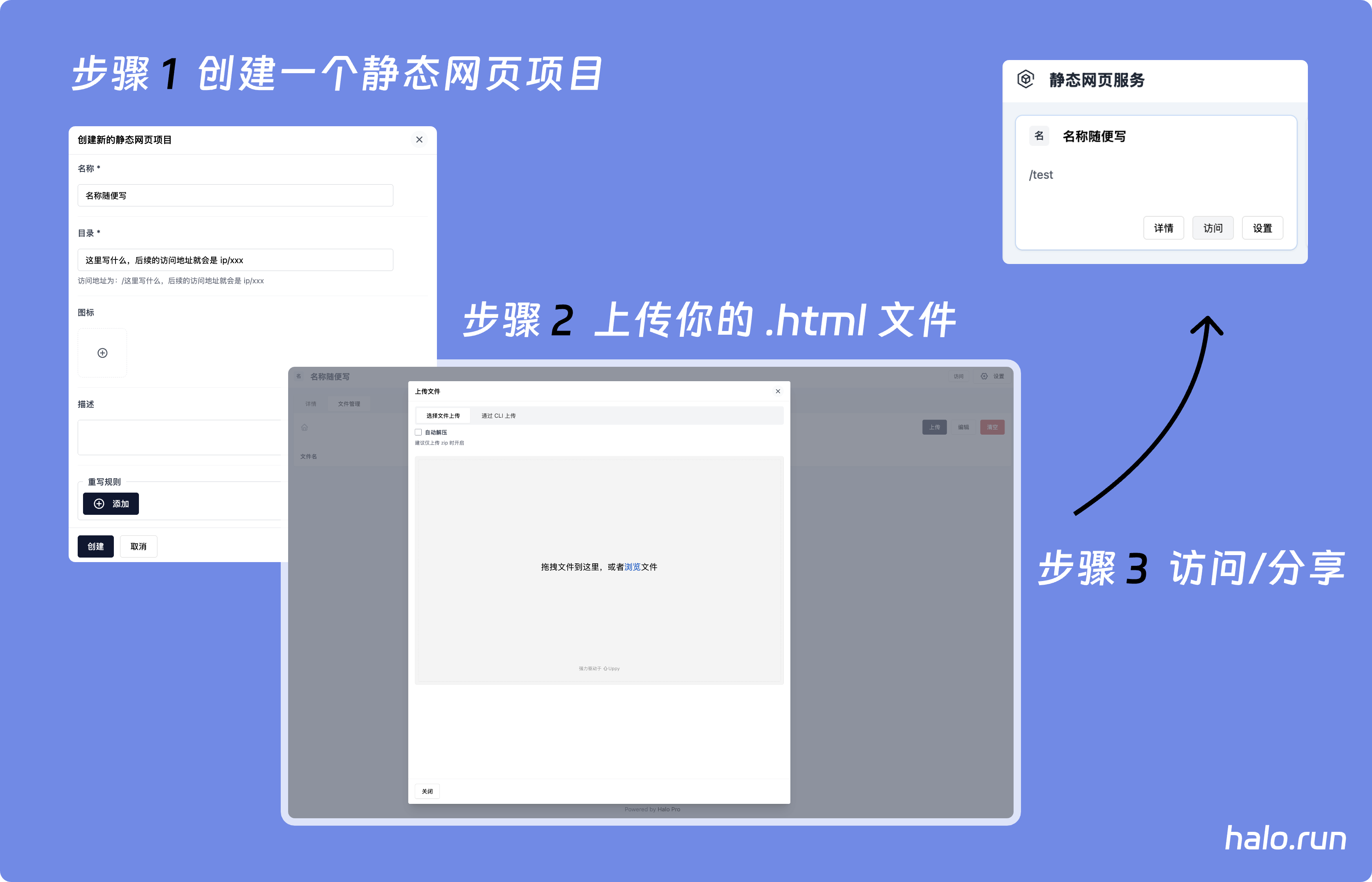 Halo 应用市场里有一个免费插件叫 静态网页服务(已被下载 19000+ 次),它做的事情非常简单:让你把 HTML 文件上传到 Halo,然后通过一个网址访问。没有 Git,没有命令行,没有全英文界面。