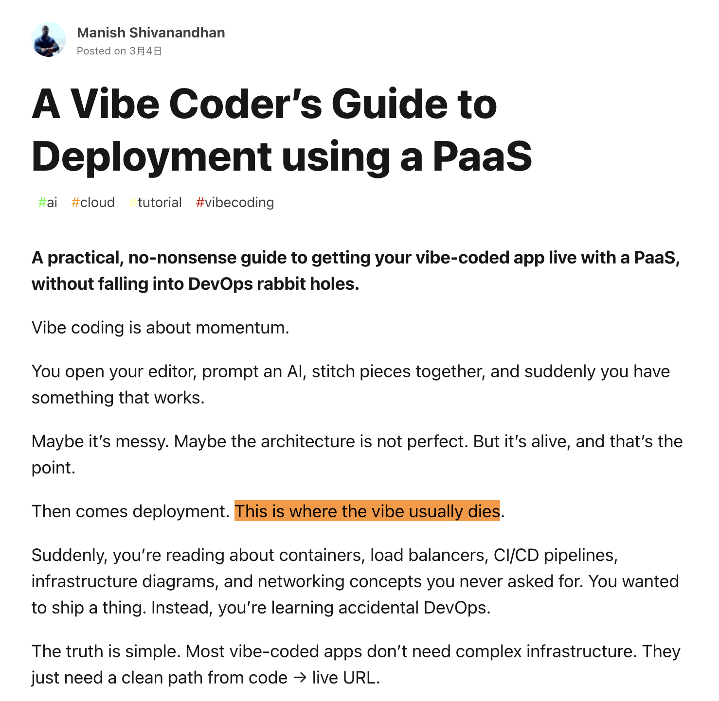 这个痛点不是臆想。DEV Community 上的热门文章直接说:"This is where the vibe usually dies"——部署是氛围消亡的时刻。一个从未接触过技术的人,跟着 AI 聊了几句就做出了网页,结果下一步要面对服务器、容器、DNS、SSL 证书这些完全陌生的概念。氛围确实消亡了。